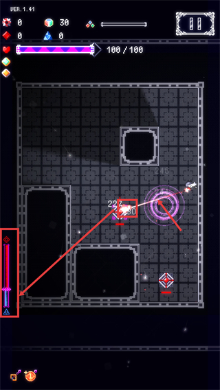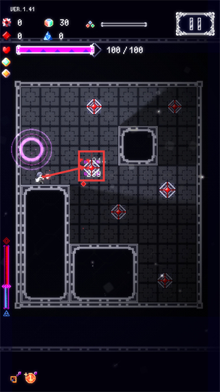 3、战斗时借助左侧武器栏里的装备来攻击敌人,注意观察出现的伤害数值,不断消灭剩下的红色菱形敌方目标。