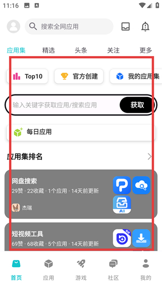 1、在首页的应用集区域找到你要找的应用集(例如【网盘搜索】),点击该应用集即可进入对应的应用列表页面。