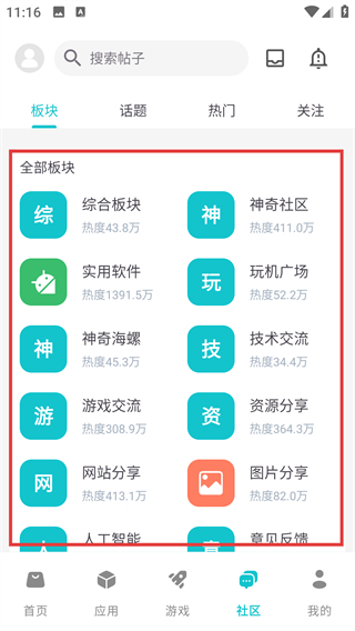 4、切换至社区页面后,可看到【综合板块】【实用软件】等分类板块,点击相应板块即可进入交流区域。