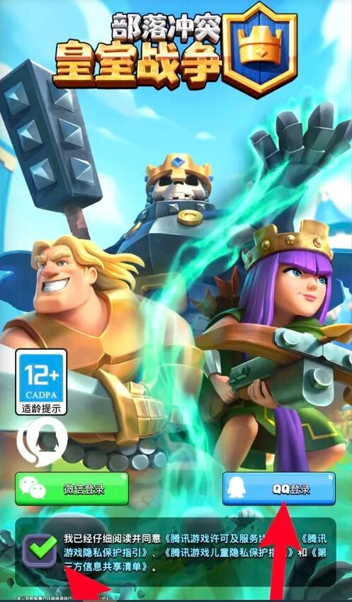 1、进入皇室战争游戏界面,勾选“已阅读”相关选项,然后点击QQ登录按钮。