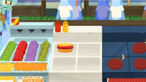4、先把肉饼煎好,接着夹进汉堡里,做好后就能递给顾客了。记得用蟹老板的爪子来收集金币哦。