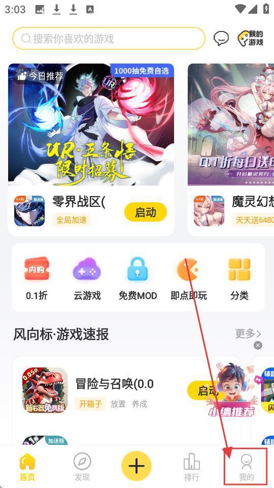 1、首页有不少游戏推荐,若想查看个人相关内容,就点击右下角【我的】按钮,进入个人页面吧。