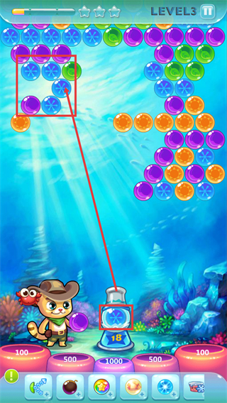 3、切换为【18】号雪花泡泡后,瞄准左上方雪花泡泡聚集区,借助消除提升分数,同时留意场景互动元素。