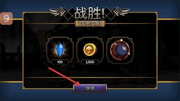 4、在对决奖励界面领取【100钻石】【2000金币】等道具后,点击【继续】按钮即可开启下一轮挑战。
