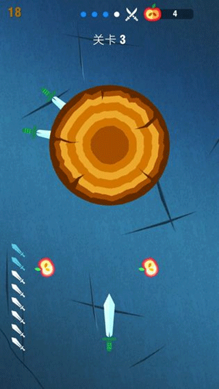 2.关卡设计机制:普通关卡会提供固定数目的飞刀,玩家要在规定的投掷次数里完成全部投掷操作;特殊关卡会加入时间限制或者Boss战模式,像需要在30秒内命中旋转树轮上的所有苹果,或是战胜带有护盾的敌人。
