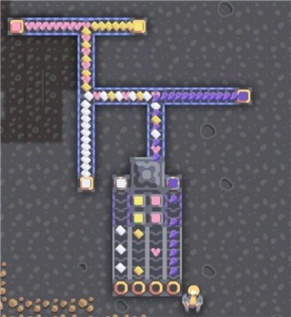 这也是放宽了对材料的要求,没有追求极致效率,只是为了让蓝图更美观。我觉得设计比较巧妙的地方是那两个沙子分类器。原本没有上方的抽水机时,沙子是直接输送下去的,一个分类器要同时承担沙子、硅、煤三种材料的分配任务。加装抽水机后,它依然能负责把煤向下输送,把硅向左右两侧输送。