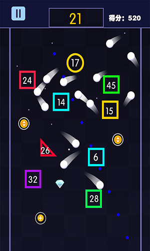 3.得分规则:每当小球击中方块时,玩家就能得到分数。方块上标注的数字代表该方块需要被击打多少次才能消除。玩家要在方块掉落至屏幕底端之前,尽可能获取更多的分数。
