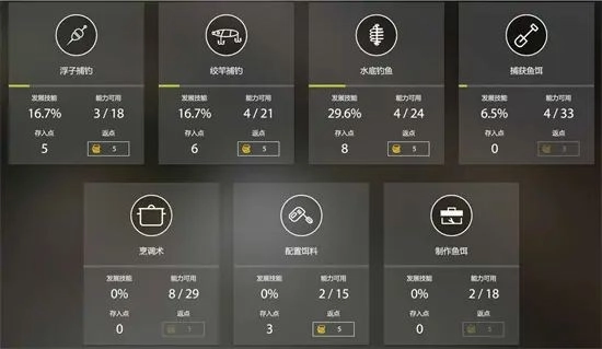 技能总共分为七大类,分别是浮子捕钓、绞杆捕钓、水底钓鱼、捕获鱼饵、烹调术、配制饵料和制作鱼饵。