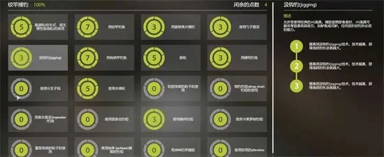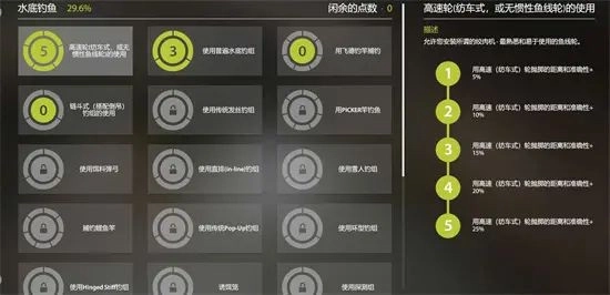 这些都加满之后,就可以考虑加绞杆相关的技能点了。要是中期喜欢玩拖钓或者路亚的话,这个肯定得点——7点用于绞杆钓鱼,3点用来用旋转亮片钓,3点针对勺子路亚,还有3点是汲钩钓的。