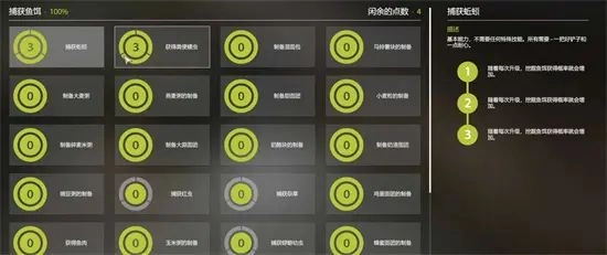 关于烹调术和制作鱼饵,需要注意的是烹调术无需手动加点,等熟练度达到要求后会自动解锁并加满;制作鱼饵其实就是手工饵的制作,前中期基本用不上,到了后期玩家可以依据自身需求来决定是否加点。
