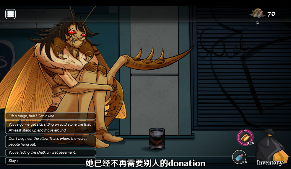 ,一款十分怪诞有趣的角色扮演类。在游戏中,玩家们将会扮演一名流浪街头的乞讨少女,每日穿梭在车水马龙的街道间,通过乞讨来维持生计,一次意外让她遇到了一个神奇的贩卖机,就此改变了自己的命运......在这款游戏里,玩家得靠持续乞讨来积累资金,再把钱投进贩卖机;贩卖机呢,会依据投币数额随机提供对应的食物。少女要靠吃下这些食物补充能量,不过吃多了就可能出现异变——比如变胖、变美,甚至直接变成别的生物!整个过程趣味十足,结局也十分多样,期待大家去深入探索!