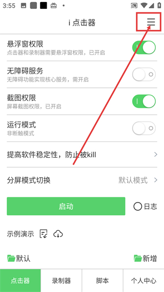 1、在【i点击器】的主界面,我点击右上角的菜单按钮,就能进入更多功能的设置页面啦。