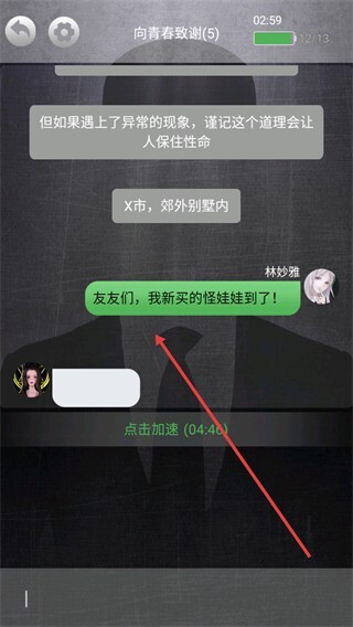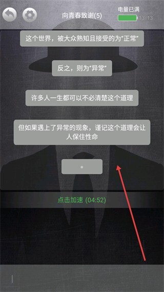 1、【向青春致谢(5)】,红箭头所指位置为对话区,点击加速(04:52)即可推进剧情。