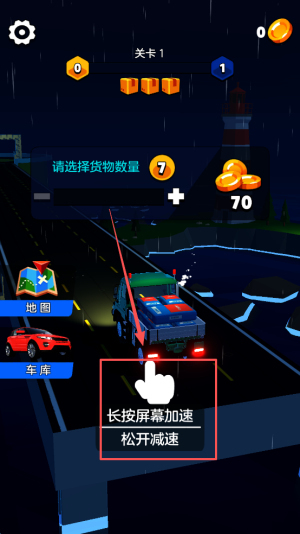 2、开启关卡:进入第1关,选定货物数量为“70”,长按屏幕即可加速启动。