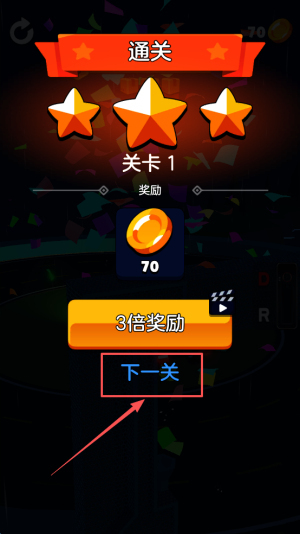 4、领取奖励:通关界面会显示“奖励70”,此时点击“3倍奖励”按钮,再点击“下一关”,即可继续进行挑战。
