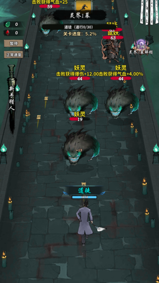 3、一边移动,一边对抗妖灵,得到满地的金币。