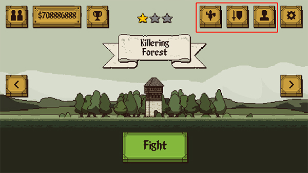 1、只需点击下方的“Fight”按钮,即可开启闯关之旅,页面最上方依次排列着训练场、武器和人物功能入口。