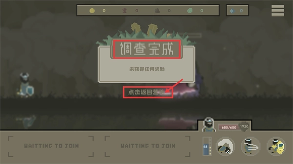 4、完成探索后会显示【调查完成】,若未获得奖励,点击【返回营地】按钮回到初始区域,准备下一轮行动。