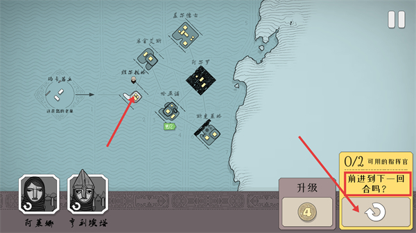 1、进入Bad-North的地图界面后,留意【0/2-可用的指挥官】这一信息,接着点击【前进到下一回合吗?】来推进冒险进程,同时要以老巢为核心规划岛屿的防御布局。