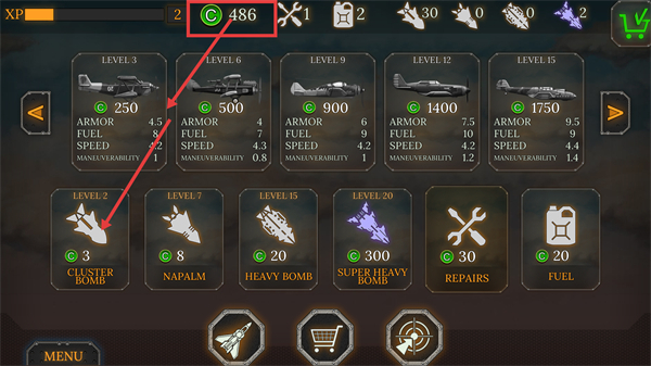 进入界面后,首先留意【LEVEL-3】到【LEVEL-15】区间的飞机选项,查看包括【ARMOR-250】在内的各项属性,再根据自身需求选用【CLUSTERBOMB3】这类道具。