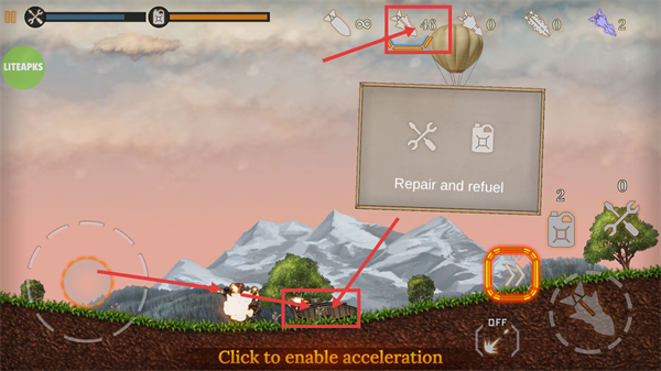 3、在场景里碰到热气球时,能够运用【Repair-and-refuel】功能,点击相应区域来开启加速,利用场景中的元素让作战状态得到优化。