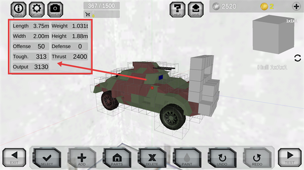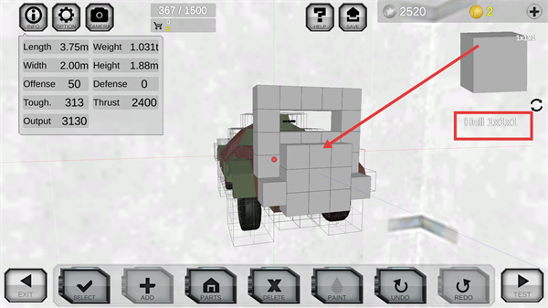 2、进入车辆编辑界面后,选中【Hull-1x1x1】模块,借助底部的【ADD】按钮添加部件,一步步搭建车辆的结构。