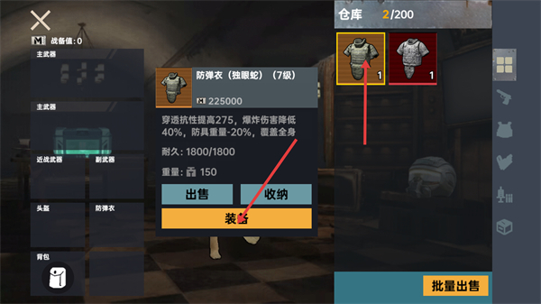 1、在仓库界面选中【防弹衣-(独眼蛇)-(7级)】,该装备具备穿透抗性提升275等属性,点击【装备】按钮就能完成穿戴。