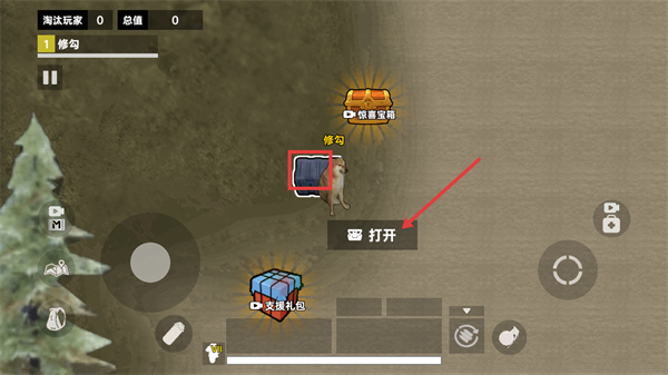 2、在对战场景里找到【惊喜宝箱】,点击下方的【打开】按钮就能获取物资,另外也可以留意一下附近的【支援礼包】。
