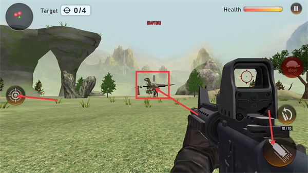 进入关卡后,请注意查看【Target-0/4】的目标计数,对准【RAPTORI】,使用剩余的【10/10】弹药按下射击键发起攻击,在此过程中还要关注【Health】的状态变化。