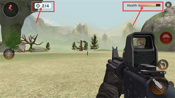 3、推进关卡过程中,留意【Target-2/4】的进度情况,关注【Health】条的状态,可利用【slow】功能来辅助瞄准剩余目标。
