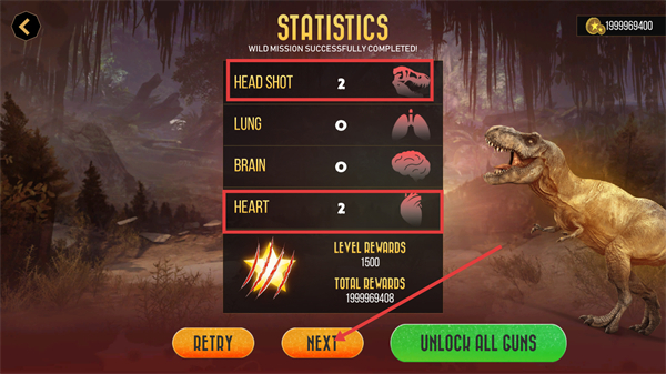 4、任务完成后,进入【STATISTICS】界面查看【HEAD-SHOT-2】等相关数据,随后领取【LEVEL-REWARDS-1500】奖励,最后点击【NEXT】按钮进入下一关。