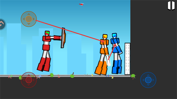 2、在对局过程中操控机甲时,可通过【红色方向控制按钮】或【蓝色方向控制按钮】来调整机甲位置,以此适配城市场景下的移动节奏,从而为后续的攻击行动做好准备。