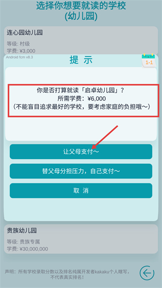 3、进入就读提示界面后,点击【让父母支付~】按钮,确认选择就读启卓幼儿园,需支付学费6000元。