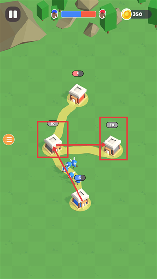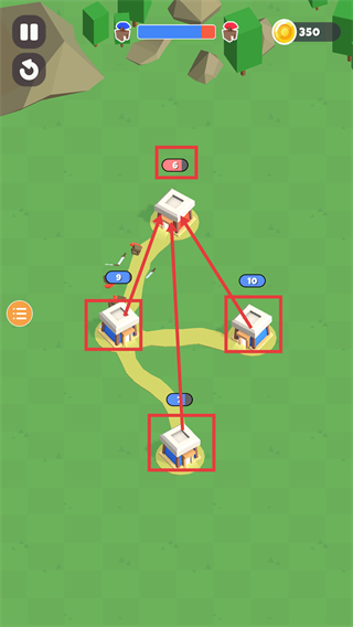 3、对战时调配兵力攻克多个标有数字的敌方建筑,借助兵力优势扩大战场优势,持续维持对战进度条的有利态势。