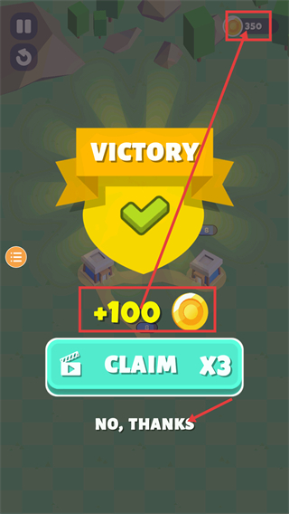 4、关卡胜利后可获得【+100】金币奖励,选择【NO,THANKS】完成结算,积累的资源可用于后续建筑解锁与关卡推进。