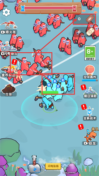 2、调用【喷火龙】-【闪电祭坛】等作战单位,通过【集结出击】集结蓝色兵力,推进当前对战的目标进度。