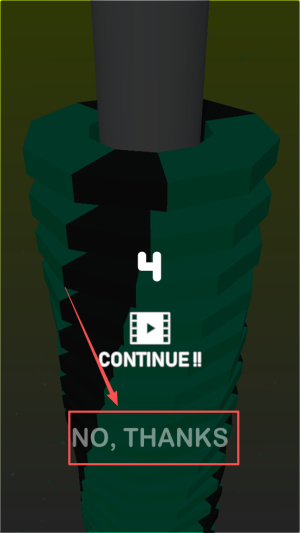 4、失败后可选择「CONTINUE!!」观看广告复活,也可以点击「NO, THANKS」重新开启新局。