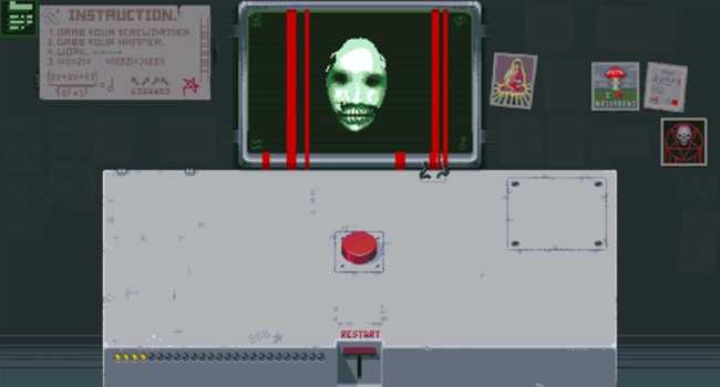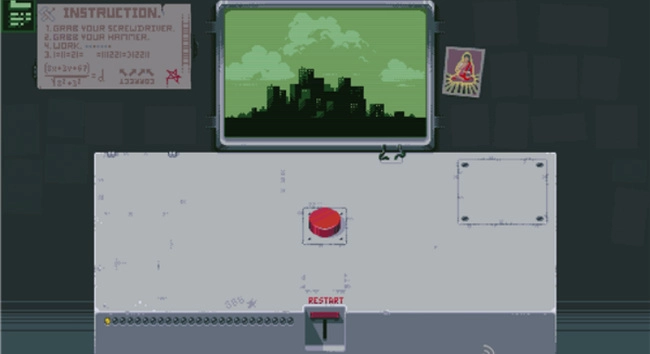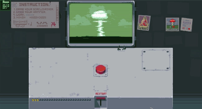 第三盏灯:先点击RESTART回到初始状态,在初始状态下点击一次红色按钮。然后会出现开关,这个时候点击一下开关,红灯亮起。再点击红色按钮,控制台的左侧会开始进入倒计时。最后屏幕出现原子弹爆炸的画面,然后就可以点亮第三盏灯了。