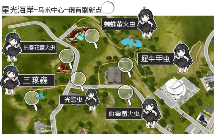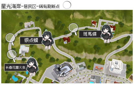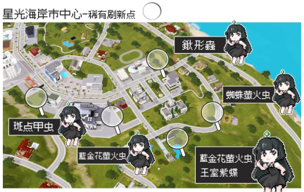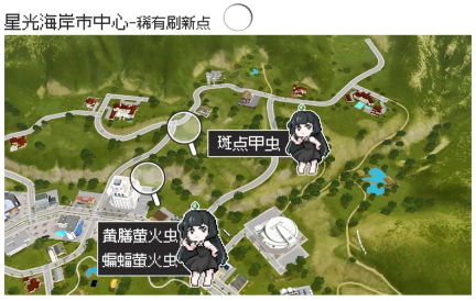 这张地图能收集到所有萤火虫,目前还没碰到彩虹甲虫,所以没法给出准确的刷新位置!(提醒:别想着在一张地图里集齐所有昆虫,得切换其他地图才行!)