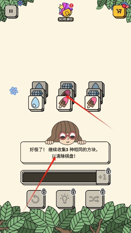 1、点击开始游戏,在水果主题关卡里第一次尝试点击三个相同的水果方块,让它们堆叠起来完成消除。
