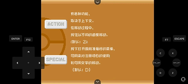 5、通过左下角的方向键可移动角色,也能用于选择项目和浏览菜单;“C”键用于确认选择以及与人物、事物对话;“X”键可实现退出、取消选择、取消模式和打开暂停菜单的功能;“Z”键具备多种功能,在移动时按住该键能让角色以不同速度移动;“D”键则用于打开预设菜单以及进行可用文字的移动操作。