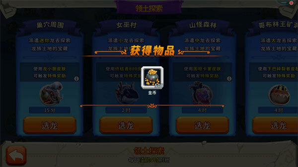 4、探索结束后,左下角会出现领奖提示,点击该提示进入页面就能领取奖励。奖励包含:金币500到10000,宝石2至25,以及福利龙蛋、高级龙蛋。