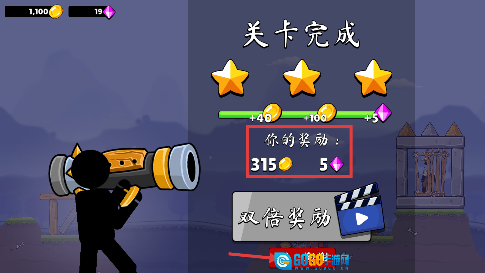 4、完成关卡后,可领取【315-金币】与【5-钻石】的奖励,你可以选择获取双倍奖励,也可以点击“不,谢谢”来继续游戏。