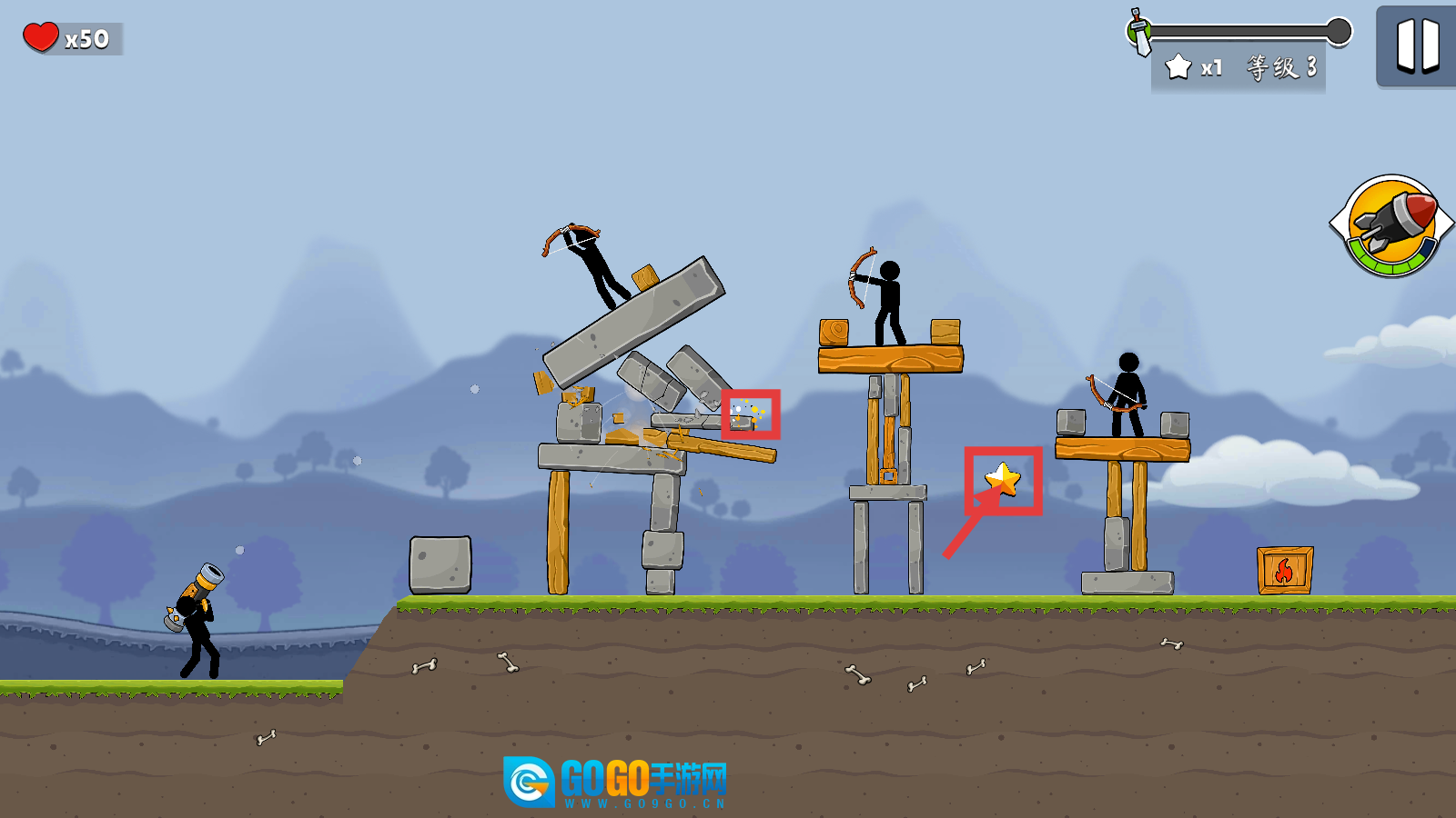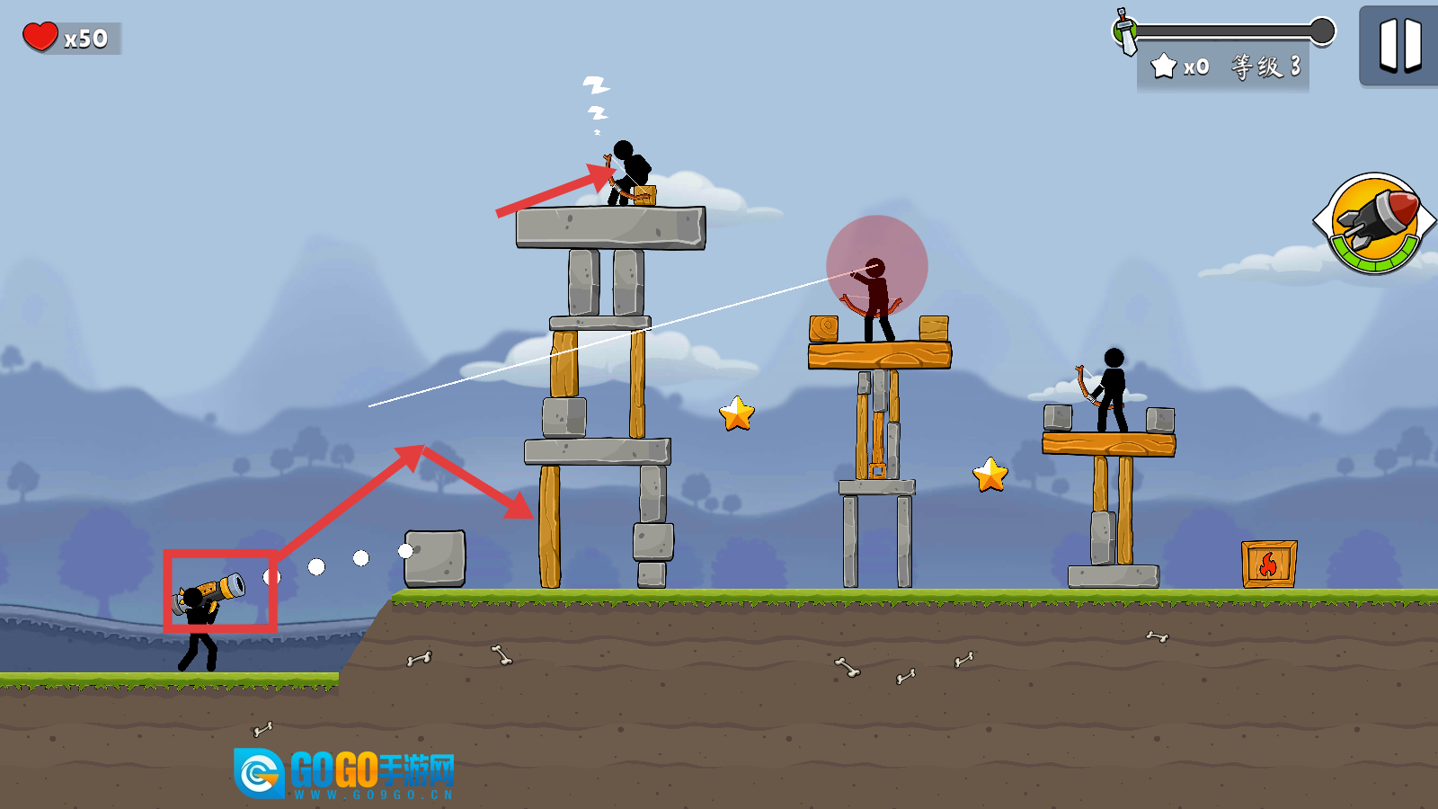 4、操作逻辑直观易懂,拉动火柴人就能锁定发射路线,松开的瞬间便完成射击,无需记忆复杂操作,新手也能迅速上手。