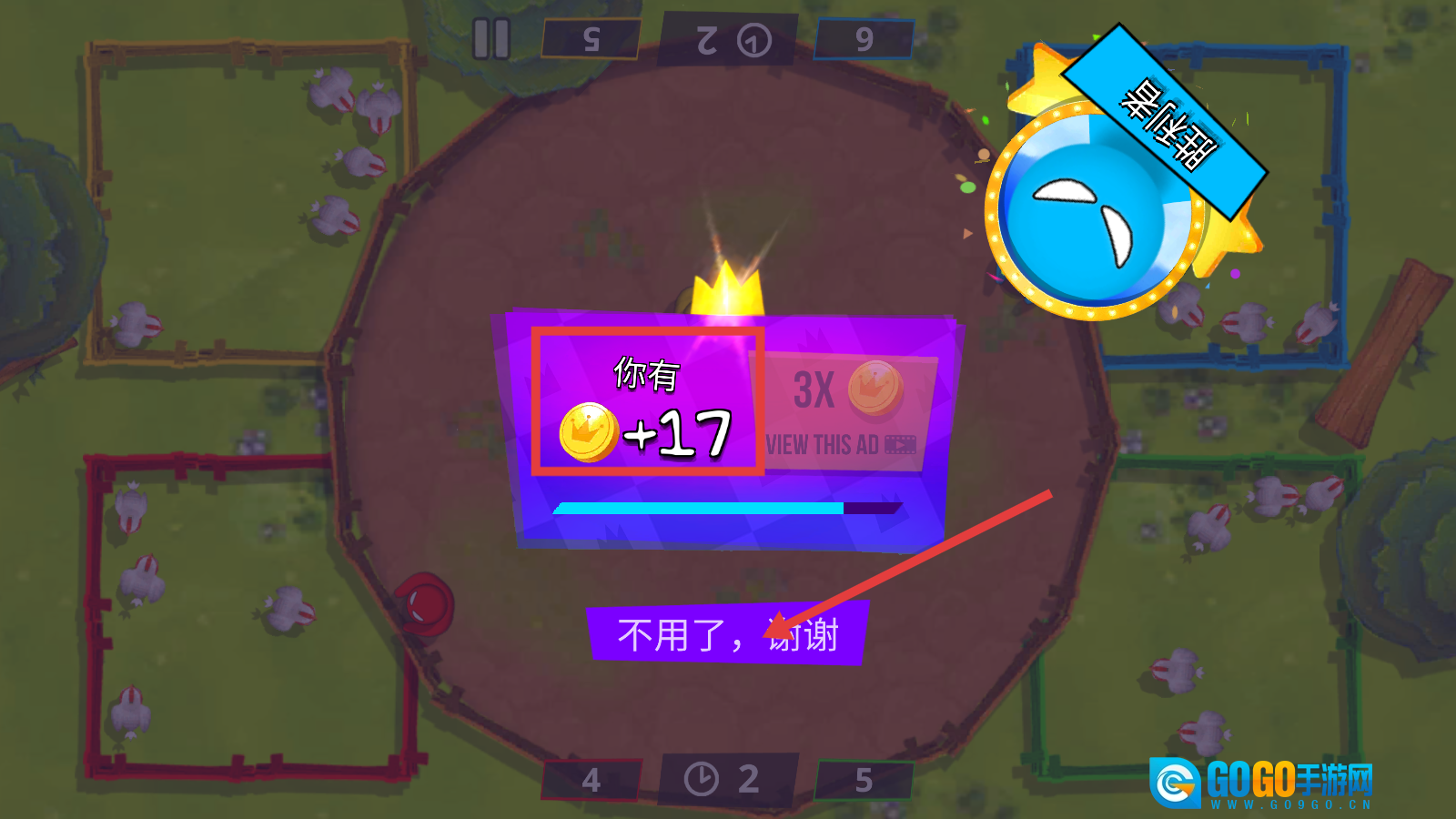 4、成功获胜后,会得到【+17-金币】的奖励,同时能看到胜利者标识,此时点击【不用了,谢谢】,就可以继续挑战下一局。