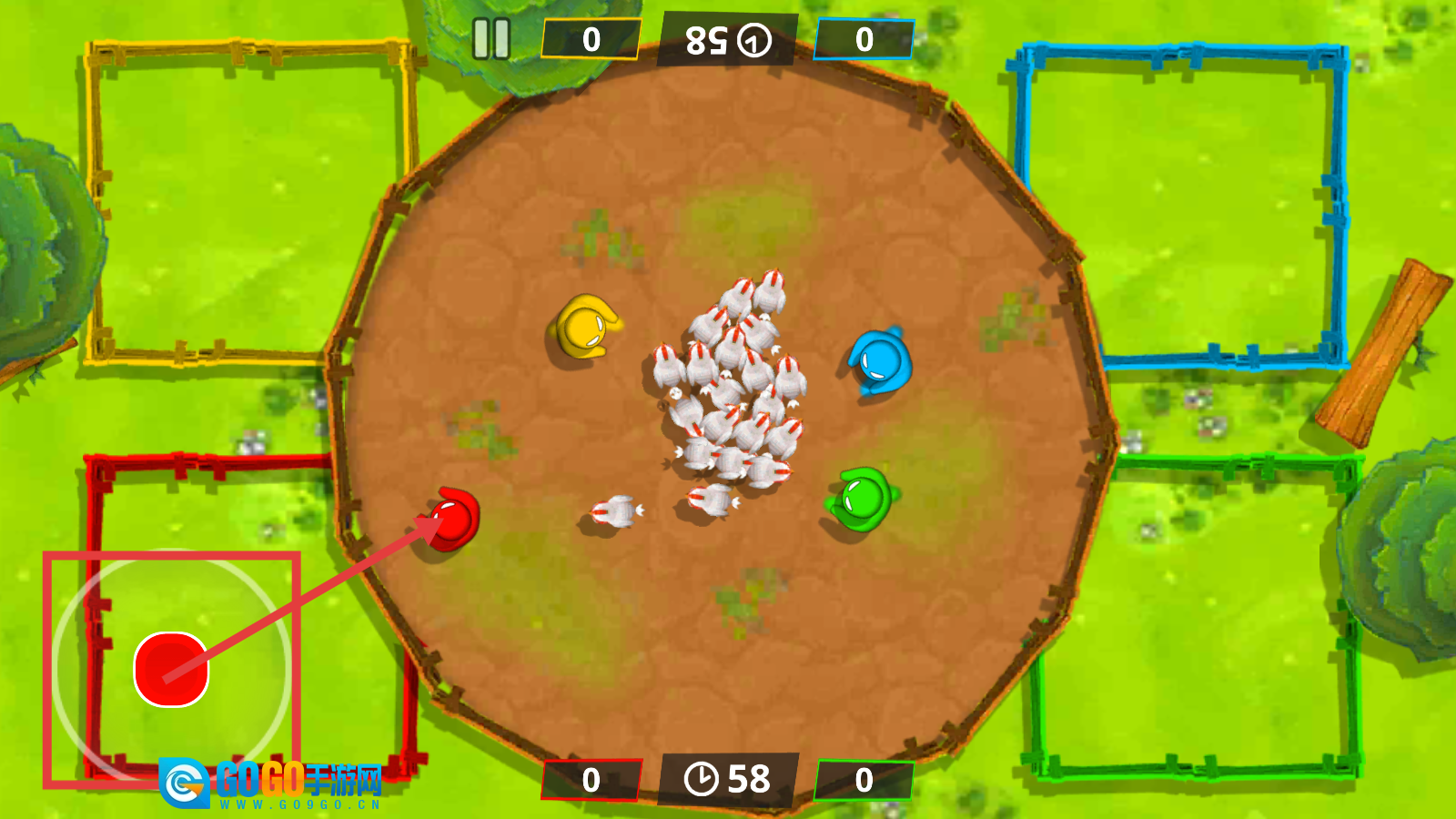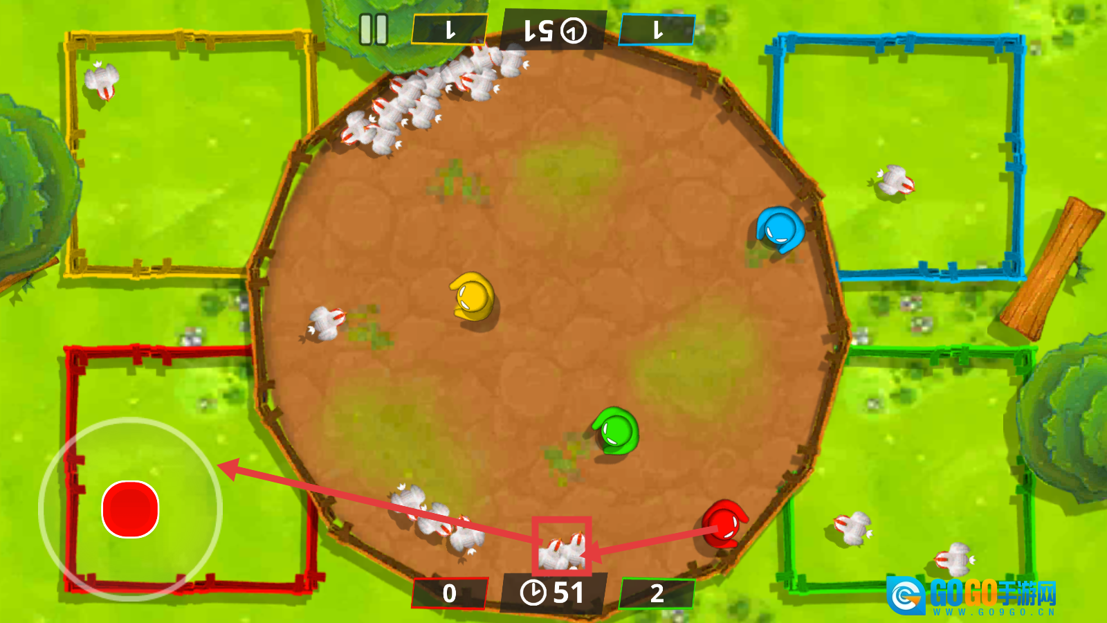 1、操作左侧的红色按钮,就能控制【红色角色】进行移动,通过收集中间的小鸡,为自己所在的区域积累资源。
