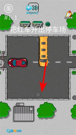 1、进入停车关卡后,移动黄色车辆按箭头方向向下,腾出驶出停车场的通道。