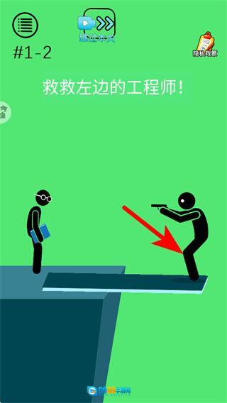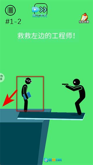 4、调整场景元素如移动踏板,让右侧持枪角色处于危险区域,从而解救工程师。