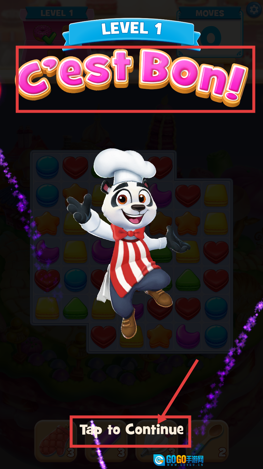4、完成LEVEL-1后,看到【C'estBon!】的提示,点击【TaptoContinue】进入下一关,同时总结消除组合和道具使用的经验。