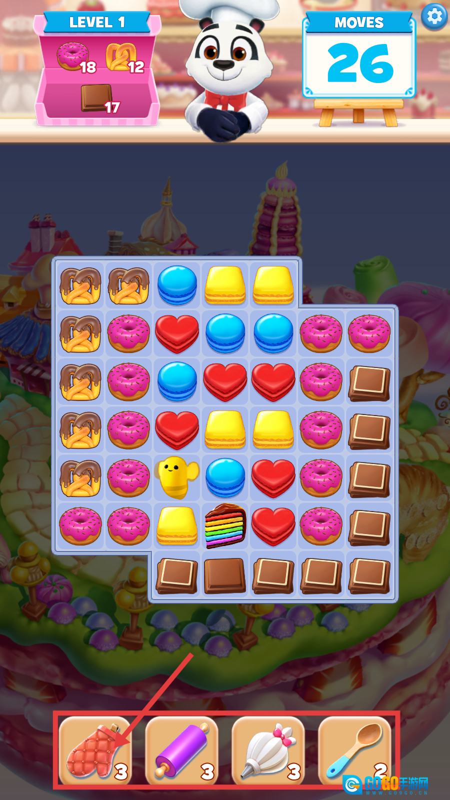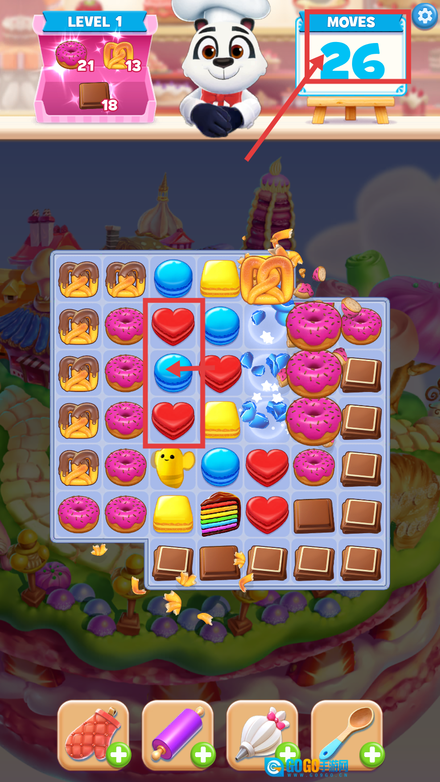 2、留意【MOVES-26】的剩余步数,借助组合消除心形、马卡龙这类元素的方式,加快削减目标物品的数量,从而推动关卡进程。